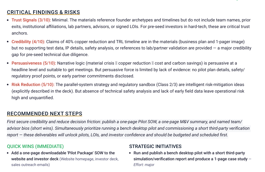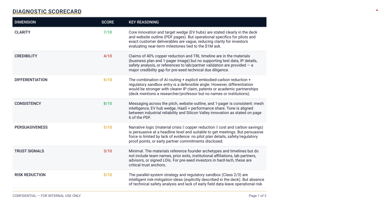 CapEnergy Insights is an AI-powered messaging diagnostics built exclusively for climate tech and energy startups. This diagnostic platform analyzes your company's messaging and returns a structured, investor-grade report in hours, not weeks.